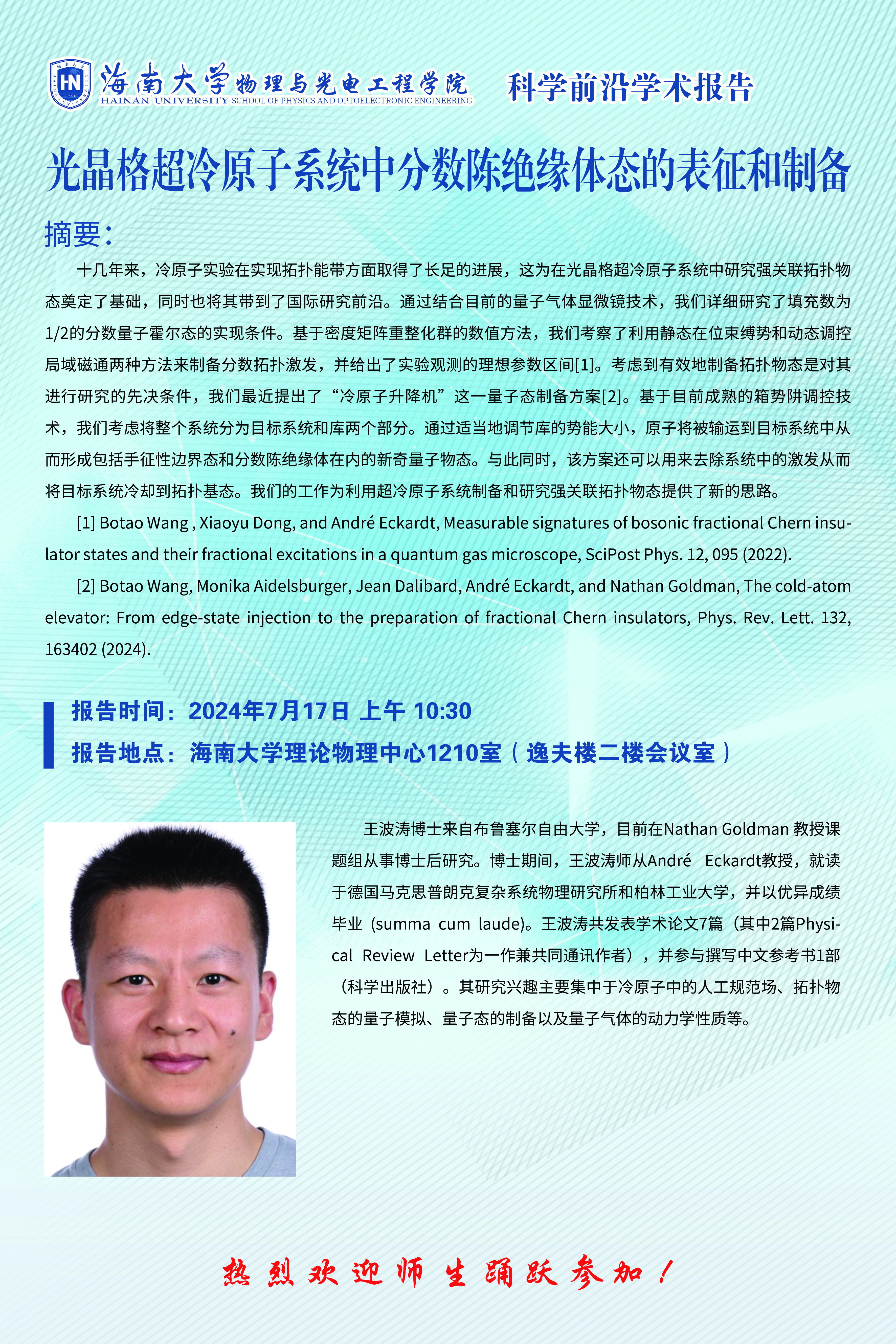 科学前沿学术报告(三十):光晶格超冷原子系统中分数陈绝缘体态的表征和制备