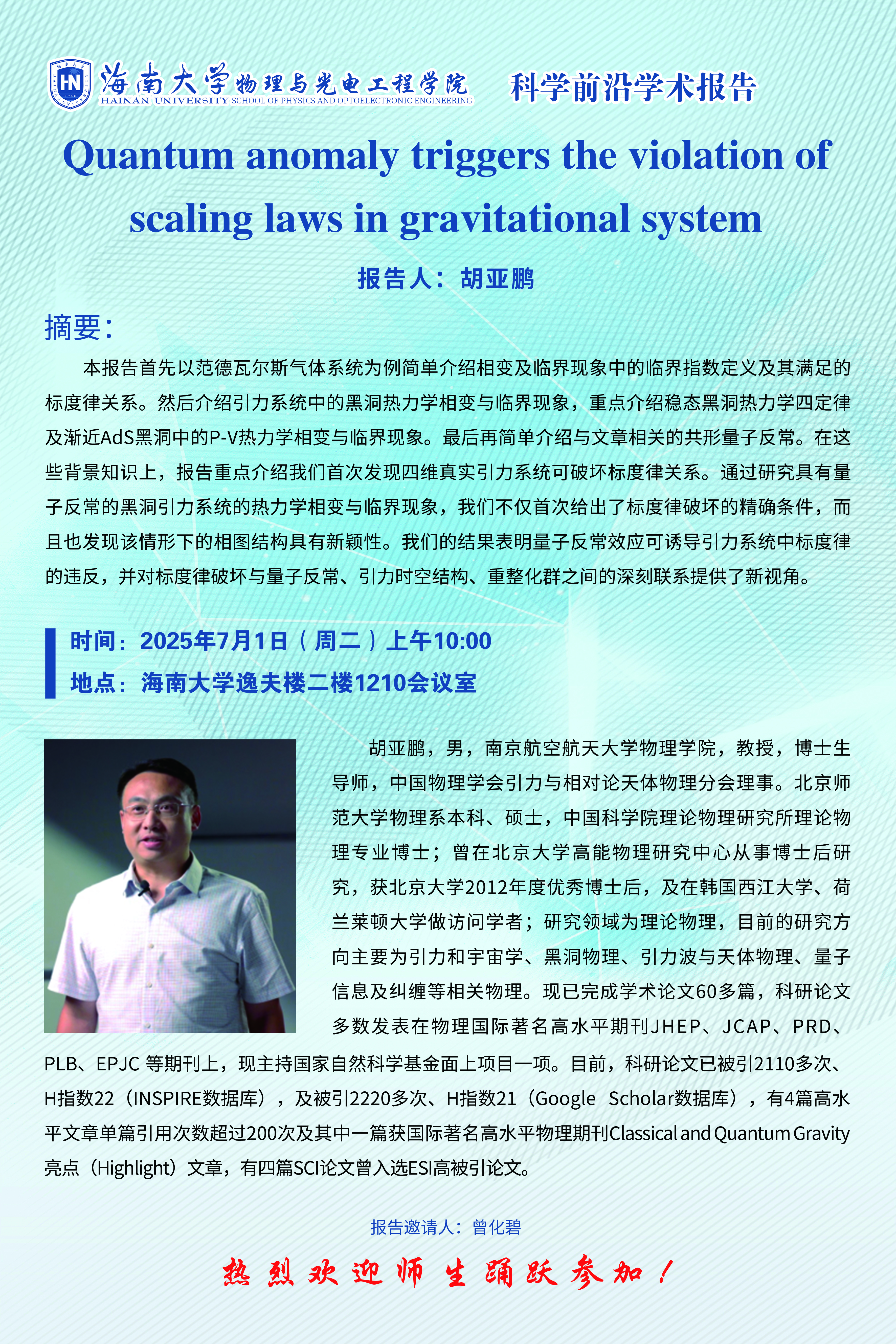 科学前沿学术报告(五十九):Quantum anomaly triggers the violation of scaling laws in gravitational system